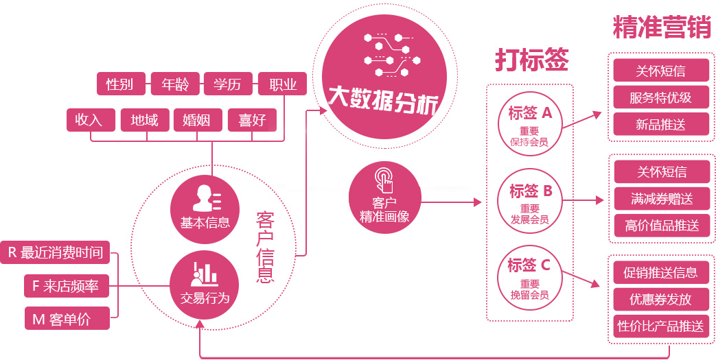 用大数据解密、追踪顾客消费行为从而清晰的辨识顾客需求,快速构建精准营销体系,并实现营销策略的全面落地