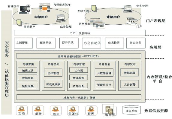 底层是企业当前存在的各种专业系统及各种内容来源,包括文件系统,关系数据库系统,文本管理系统,电子邮件系统等。它是企业内容管理及信息门户的内容的源泉。